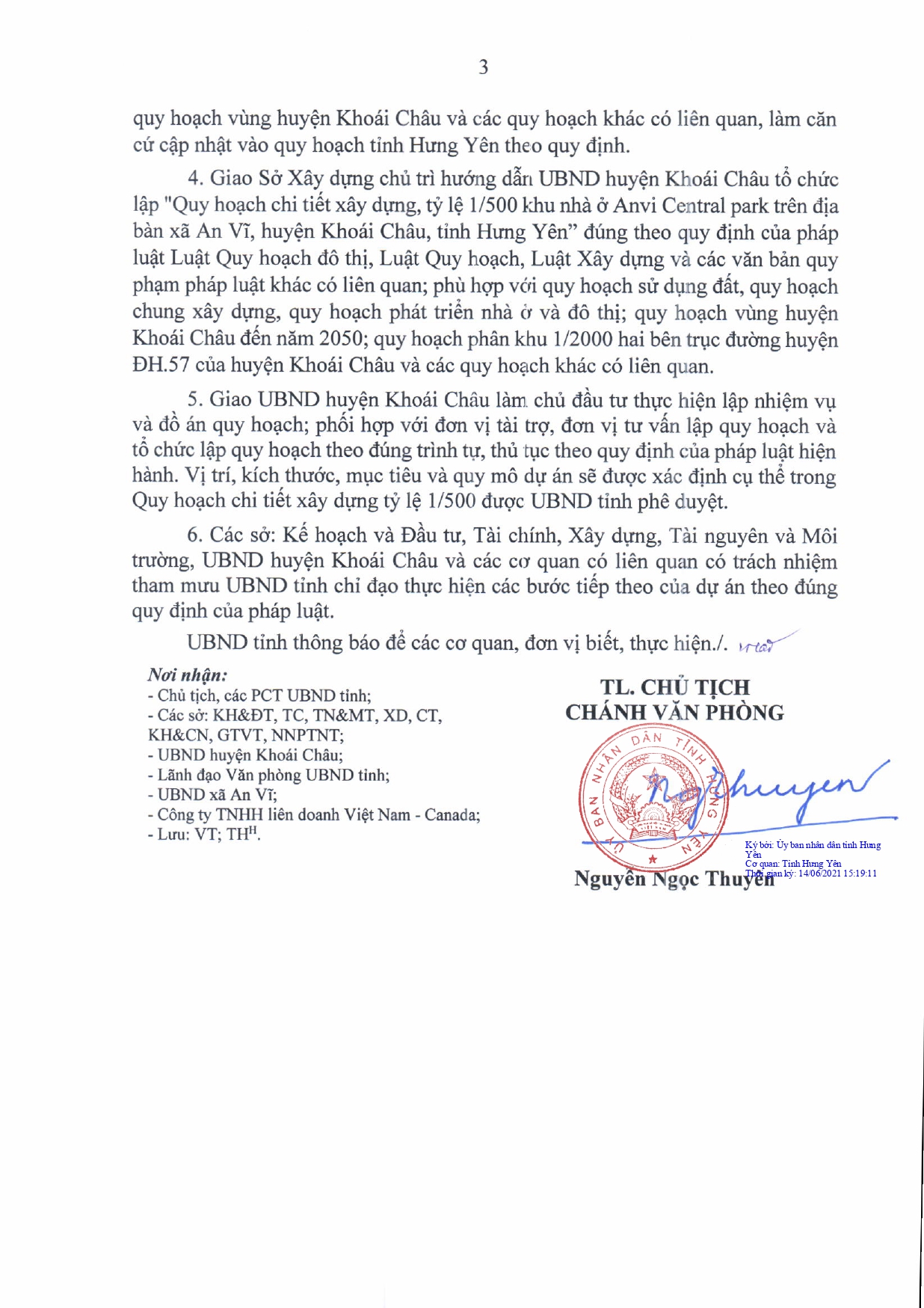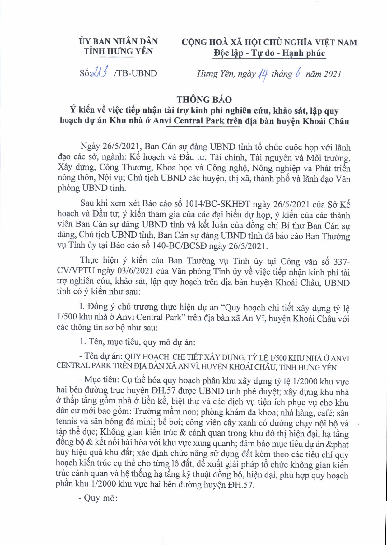 Ngày 14/6/2021, UBND Tỉnh Hưng yên đồng ý tiếp nhận kinh phí tài trợ của Công ty Cổ phần Tập Đoàn CAVI để nghiên cứu, khảo sát, lập quy hoạch dự án Khu nhà ở ANVĨ Central Park trên địa bàn huyện Khoái Châu, tỉnh Hưng Yên.